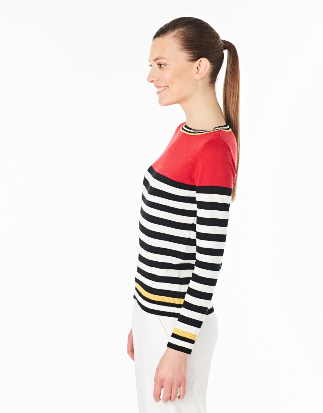 Jersey de punto fino con rayas en color rojo , corte recto, cuello caja y manga larga.