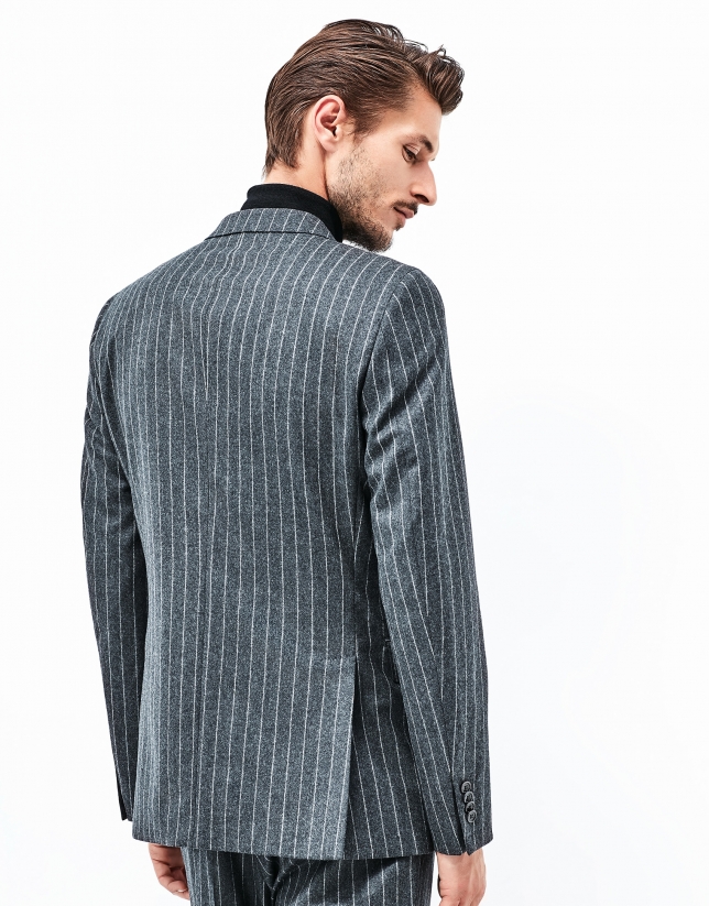 Traje de corte slim fit que se adapta a la perfección, está realizado en una raya diplomática de lana súper 100's en tonos grises de altísima calidad y tacto muy suave, este traje dos piezas consta de una chaqueta de dos bolsillos y dos aberturas que facilitan el movimiento y un pantalón de corte elegante con dos bolsillos en la parte trasera. Confeccionado en tejido italiano.