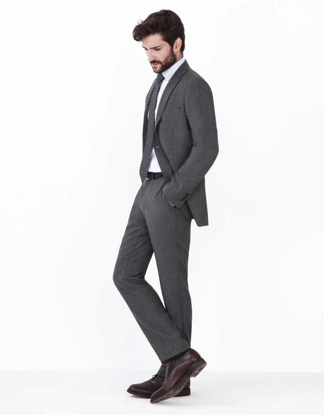 Traje regular fit realizado en una lana 100% en color gris oscuro con micro-dibujo de pata de gallo que le aporta un aire elegante y contemporáneo, está compuesto por dos piezas, una chaqueta de dos bolsillos y dos aberturas y un pantalón de corte clásico con dos bolsillos en la parte trasera.