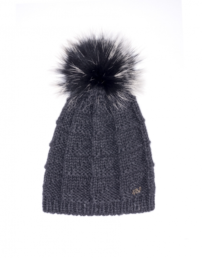 Gorro en punto jacquard de cuadros en gris antracita con pompón en pelo natural y Placa metálica RV cosida.