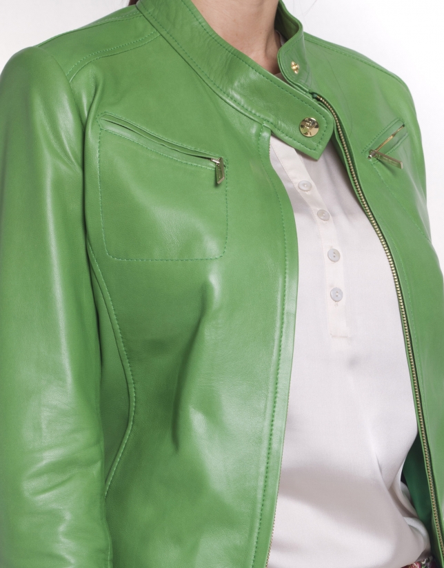 Cazadora piel con cierre cremallera de doble carro. Costuras laterales con bolsillos. Cuello tira.
