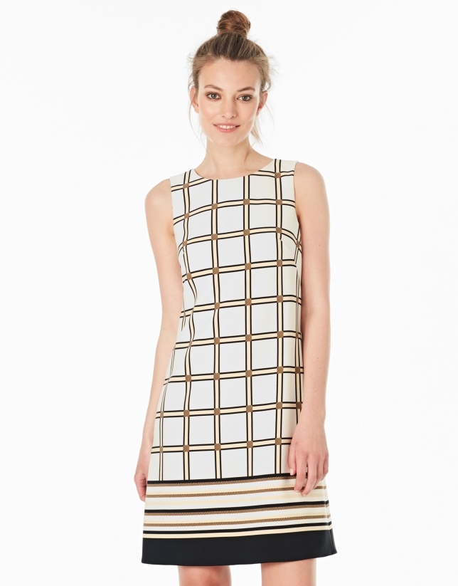 Vestido cuadros de línea A, sin mangas, escote redondo y cierre con cremallera oculta en espalda.