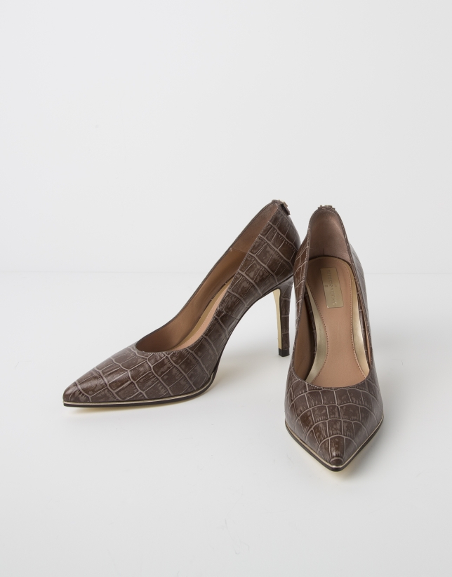 Salón piel vacuno grabada coco color arena. Cerquito dorado en piso. Tacón altura 8,5 cm. Tallas 36 a 40.